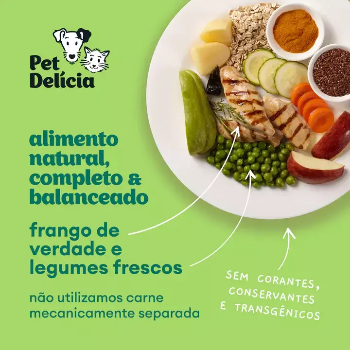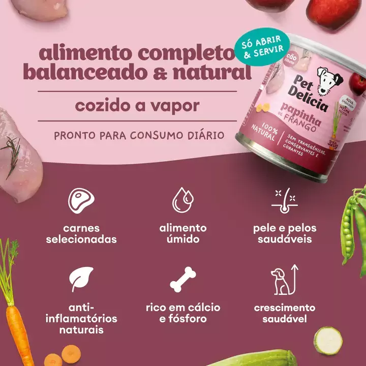 Desenvolvemos a papinha de frango para os mais novos membros da família com uma dose extra de valor nutricional e muito amor! Deliciosa receita 100% natural, completa e balanceada para cães filhotes, feita com peito de frango, legumes frescos, frutas e ingredientes funcionais. Rica em proteínas e gorduras saudáveis inclusive ômegas 3 e 6 para proporcionar um crescimento saudável e uma pelagem bonita desde filhote.
